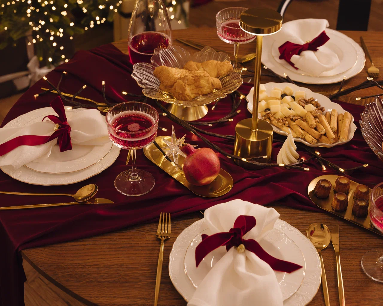 Рождественский или новогодний ужин: Бордовый и золотой — классическая праздничная палитра. Гирлянду из набора дополните шарами и свечами.