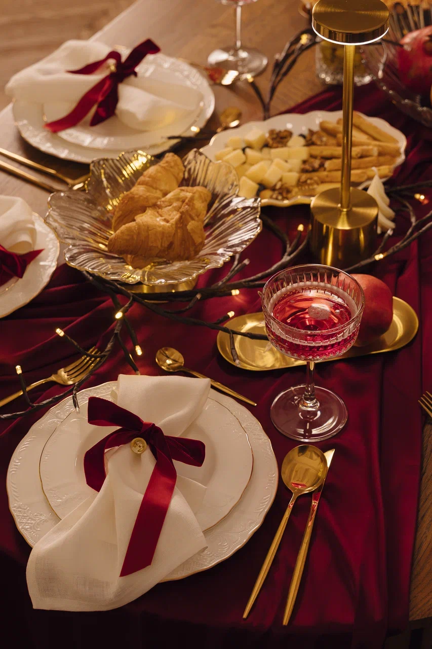 Мы соединили благородство классического стиля с драматичной эстетикой цвета. Бархатные ленты, льняные салфетки, фарфор с золотой каймой и сияющие акценты — каждый предмет говорит об изысканном вкусе. Это не просто посуда, а законченная декорация для вашего самого особенного праздника.