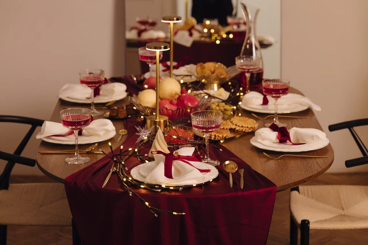 Рождественский или новогодний ужин: Бордовый и золотой — классическая праздничная палитра. Гирлянду из набора дополните шарами и свечами.