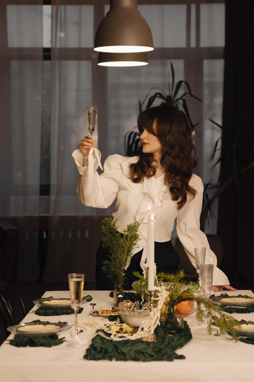 Романтический ужин при свечах: Расставьте латунные подсвечники по центру стола. Темно-зеленые салфетки и икорница добавят шика.
